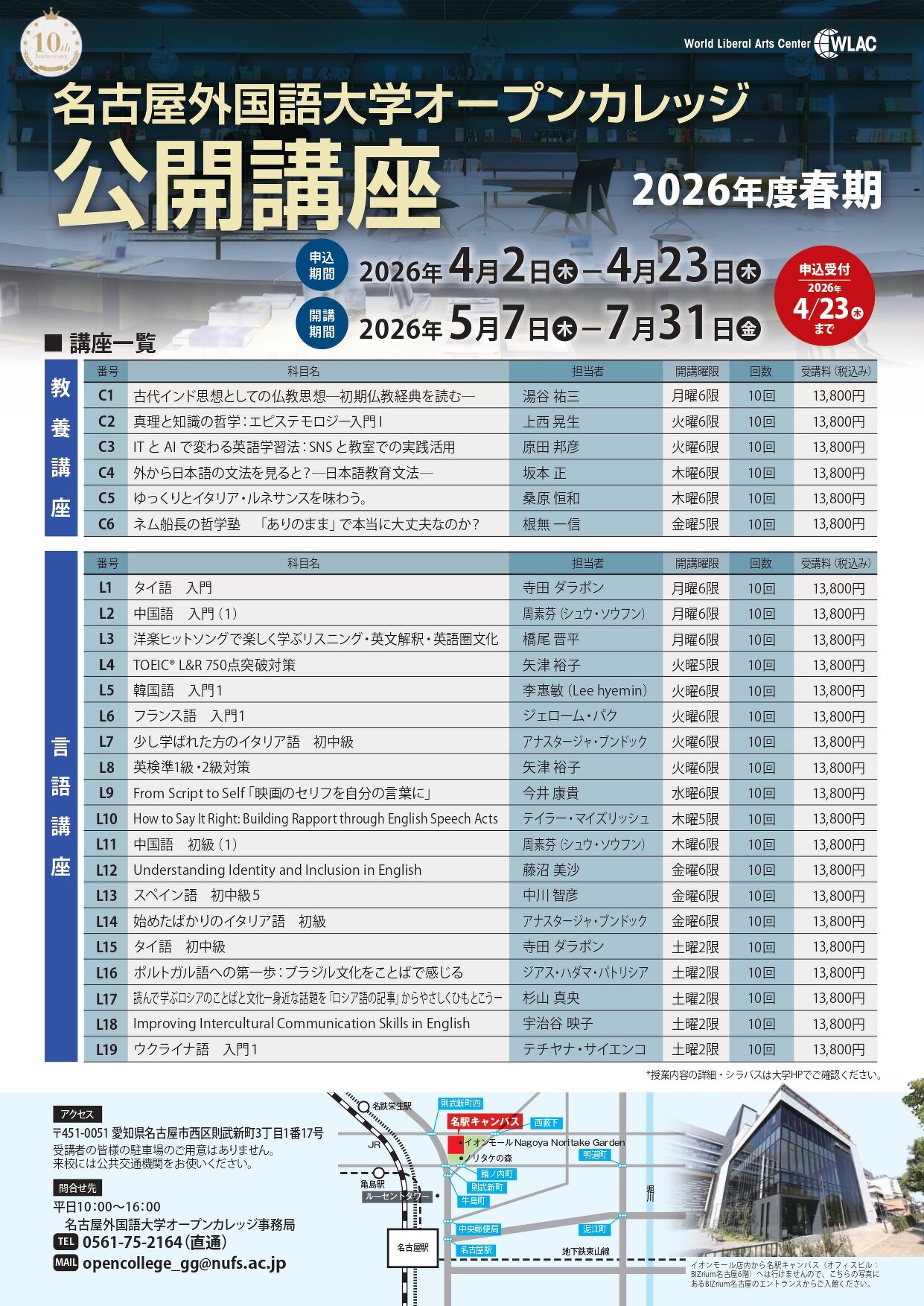 【名古屋外国語大学オープンカレッジ「2026年度春期オープンカレッジ」参加者募集!】