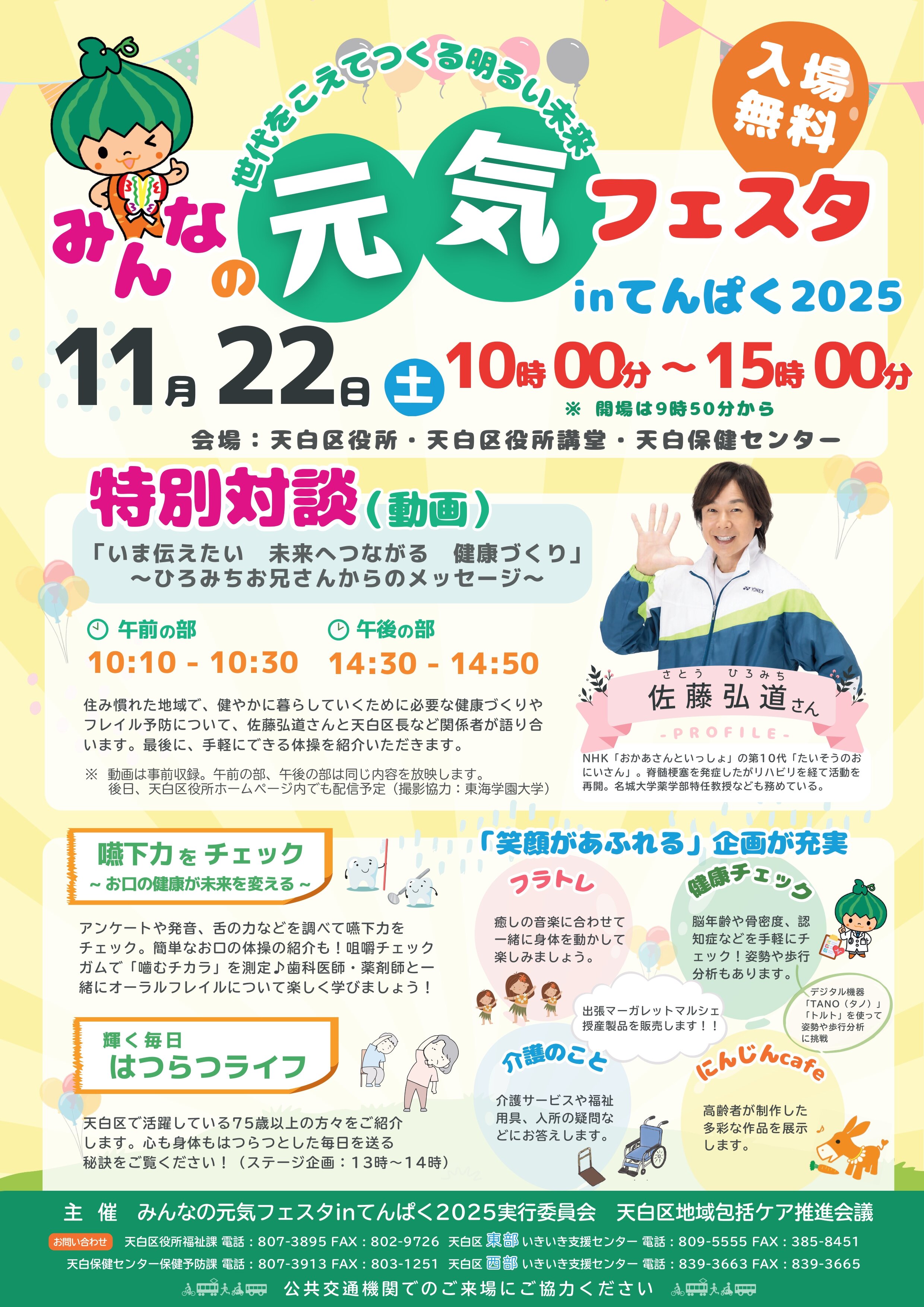 いつまでも住み慣れた地域で、元気に暮らし続けられる社会の実現を目指して、「みんなの元気フェスタ in てんぱく」を開催します。