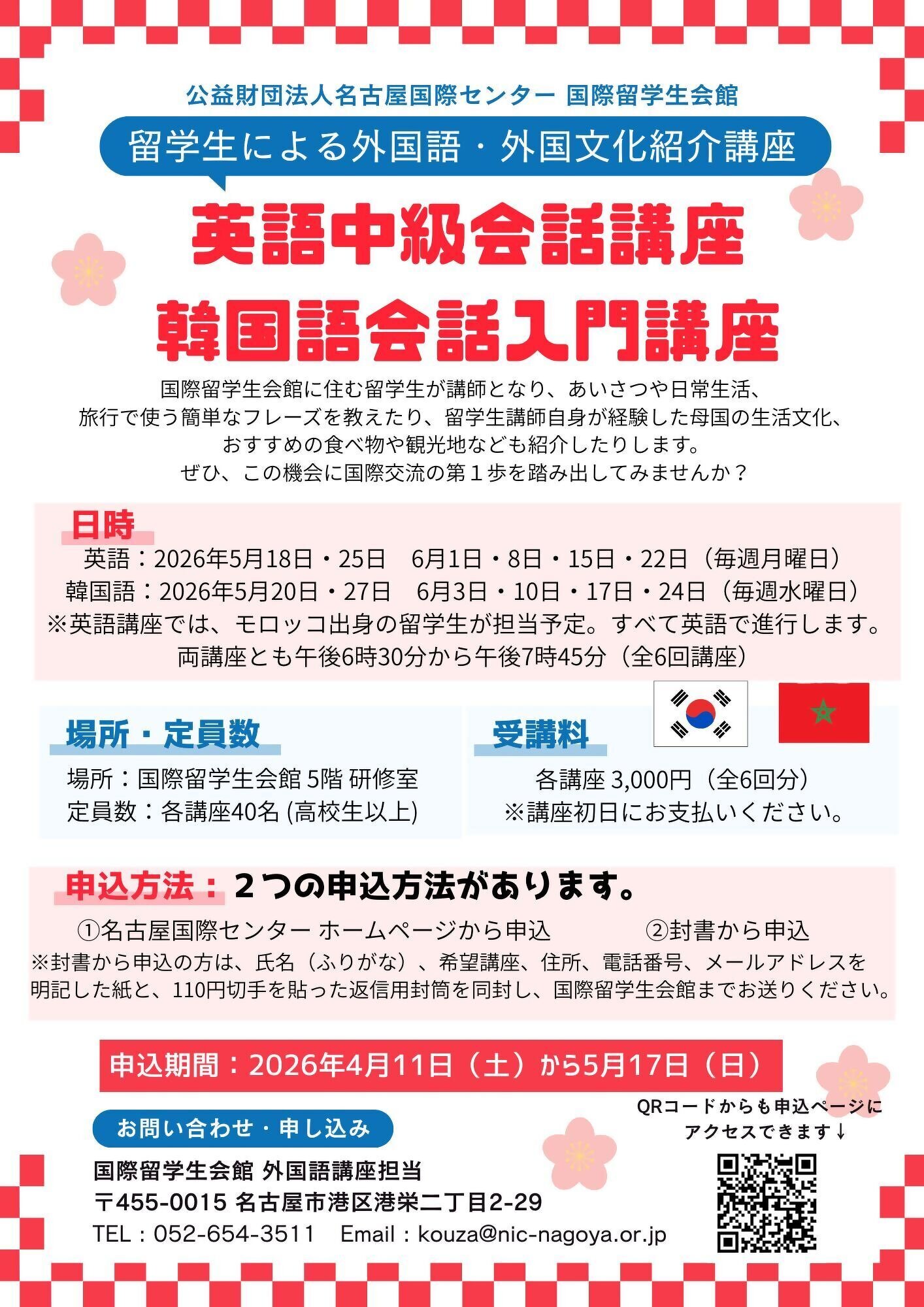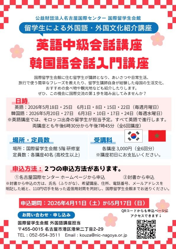 詳細はチラシ、または名古屋国際センターホームページ内の外国語講座ページをご覧ください♪
