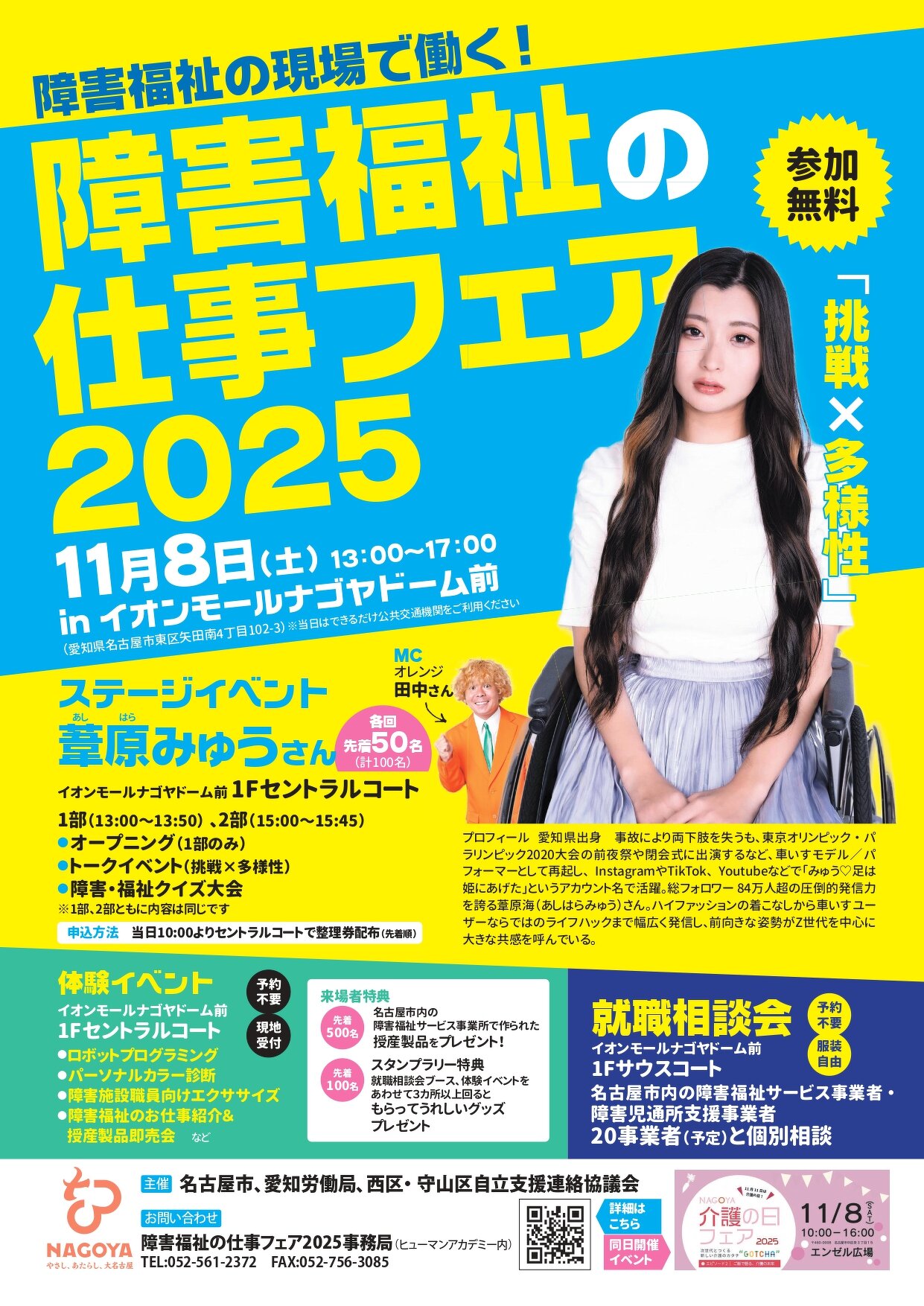 名古屋市では障害福祉の仕事に興味をもってもらうきっかけ作りや人材確保のため、愛知労働局、西区・守山区自立支援連絡協議会と共催で、「障害福祉の仕事フェア2025」を開催します。