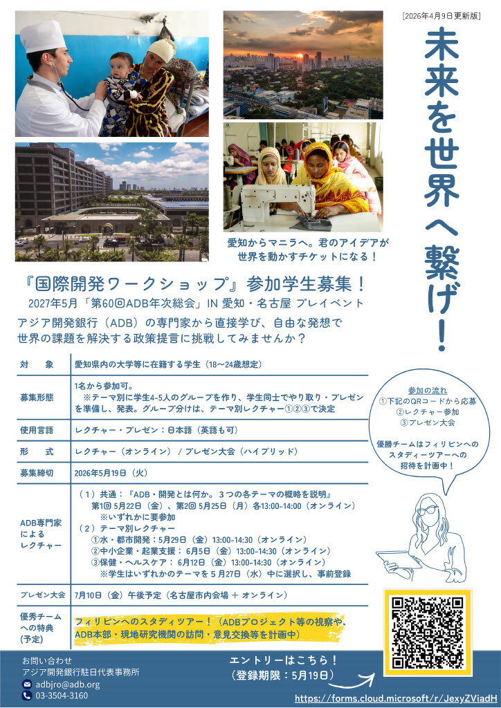 年次総会のプレイベントとして、アジア開発銀行が愛知県内の大学等に在籍する学生を対象にしたワークショップを開催します。