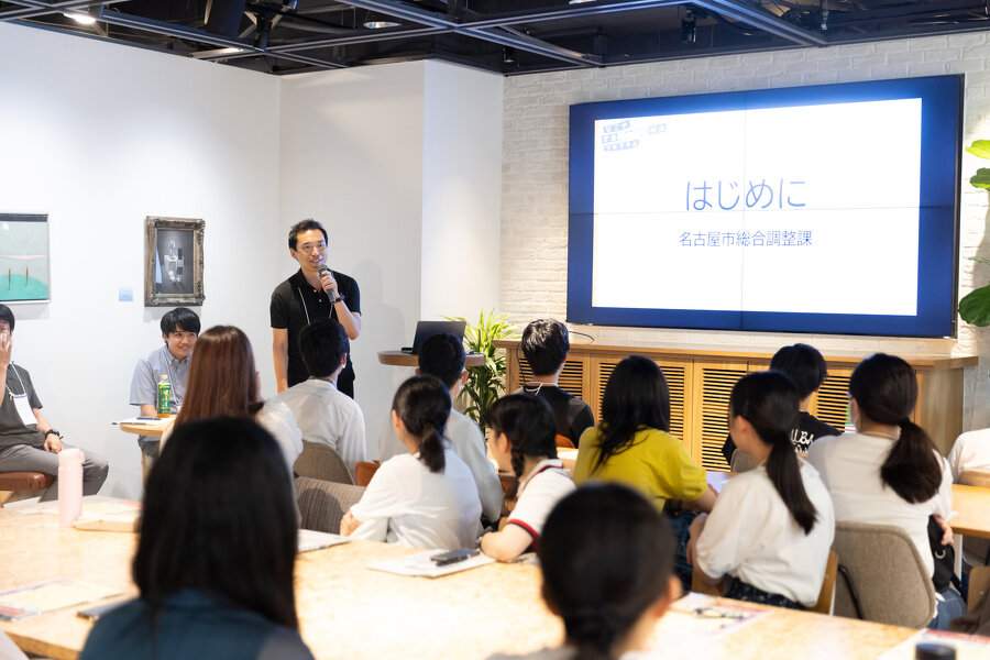 はじめに、名古屋市総合調整課の河村担当課長より学生のみなさんへ、「このプログラムでの繋がりをぜひ持ち帰って欲しい。ネットワークを持っている人は社会人になってから強くいられる。ここで培った人と人との繋がりは社会に出てからきっと役に立つと思います。ぜひ繋がりも意識していただきながらぜひこのプログラムを遂行して欲しいと思います!」と熱い応援メッセージをいただきました。