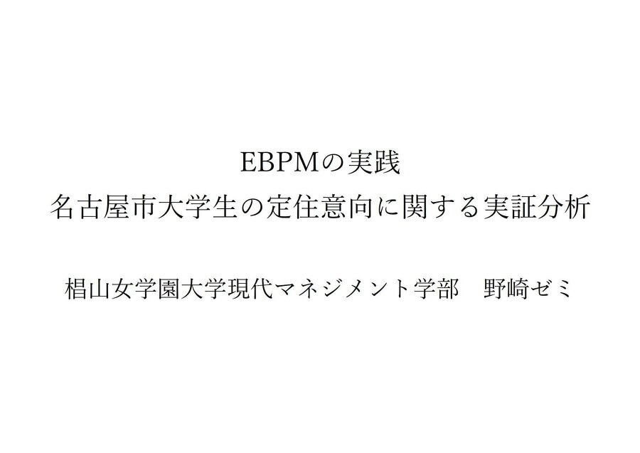 野崎ゼミでは、名古屋市の後援のもと、市内大学・大学院に通う学生を対象に独自のWebアンケート調査を実施し、定住意向と生活満足度の関係を回帰分析により検証しました(2024年11月~12月実施、有効回答318名、分析対象306名)。分析では、①定住意向の決定要因、②生活満足度を高める要因、③入学前の期待と入学後の評価のギャップ、の3点を検討しました。
