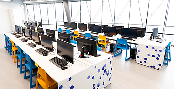 名古屋駅から徒歩3分、地下直結で近隣エリアからも通いやすいキャンパスです。PCルームやモーションキャプチャースタジオ、3Dプリンターや産業用ロボットなど実践的な取り組みを通して技術をのばすための最新設備も充実しています。