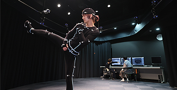 人の動きを精度高くデータ化できるシステムとグリーンバックで実写やVFXの素材を撮影。
