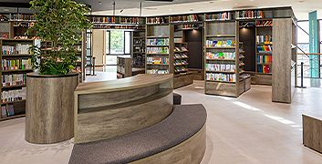 丸善書店が入ったBook Cafe。自習・交流に最適な空間で、書籍や文房具を学生割引で購入可能です。