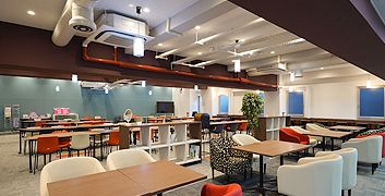 学生の声から誕生したおしゃれで居心地のよいフリースペース。学生主催のイベントを定期的に開催。