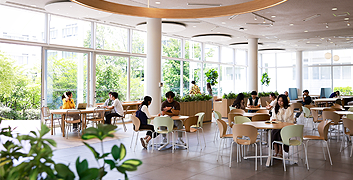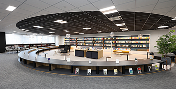 本学教員が所蔵していた様々な分野の書籍を展示。また、学生がランチタイム・休憩で過ごす空間です。
