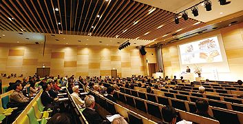 4ヵ国語の同時通訳ブースを備えた大ホールです。様々なイベントを実施しています。