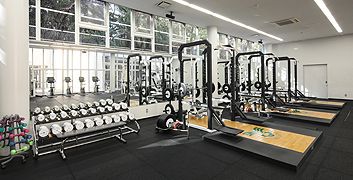 人間健康学部の授業などで使用する本格的なトレーニングルームを完備(NSCA認定)。ベンチプレスが並んでいます。